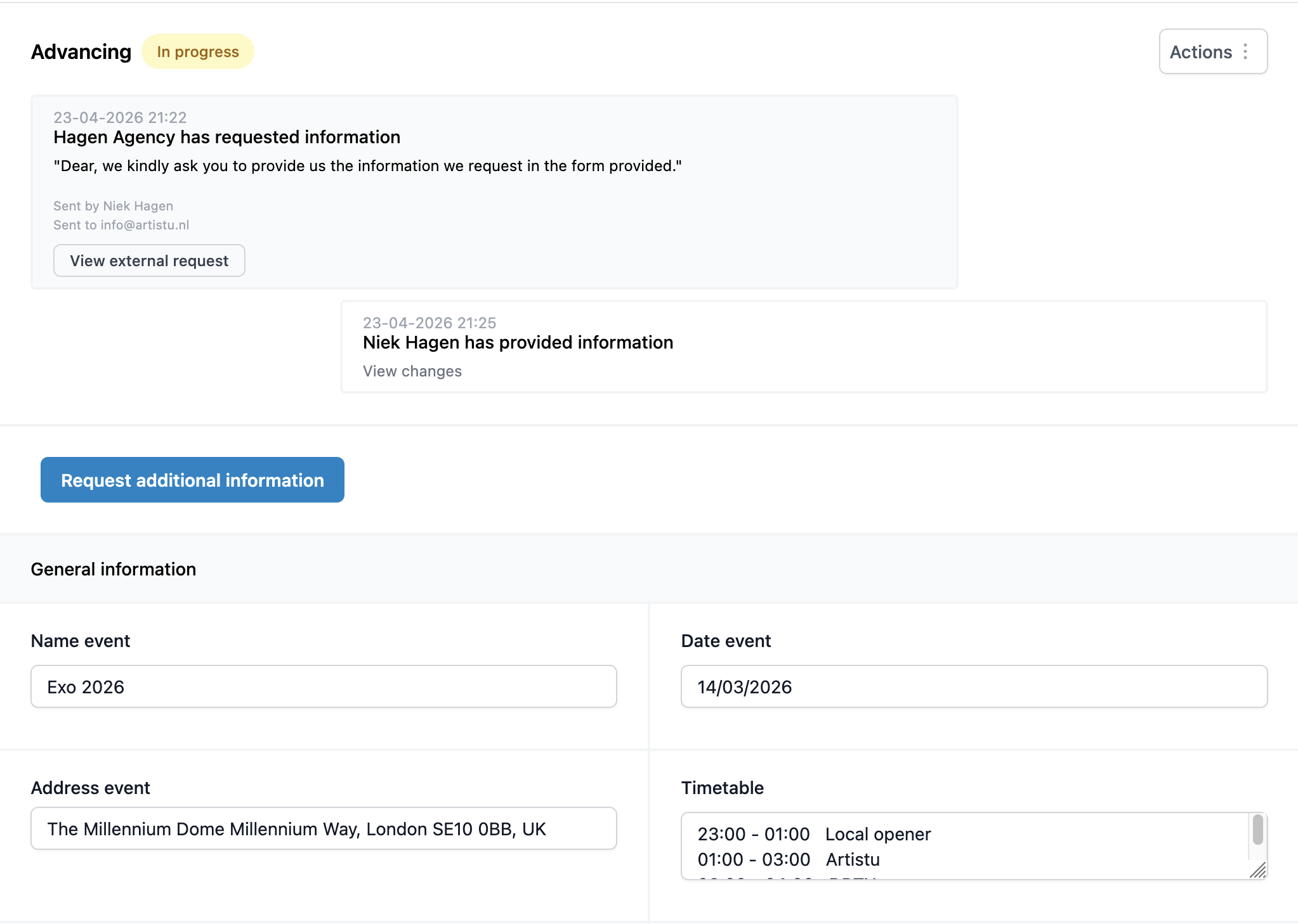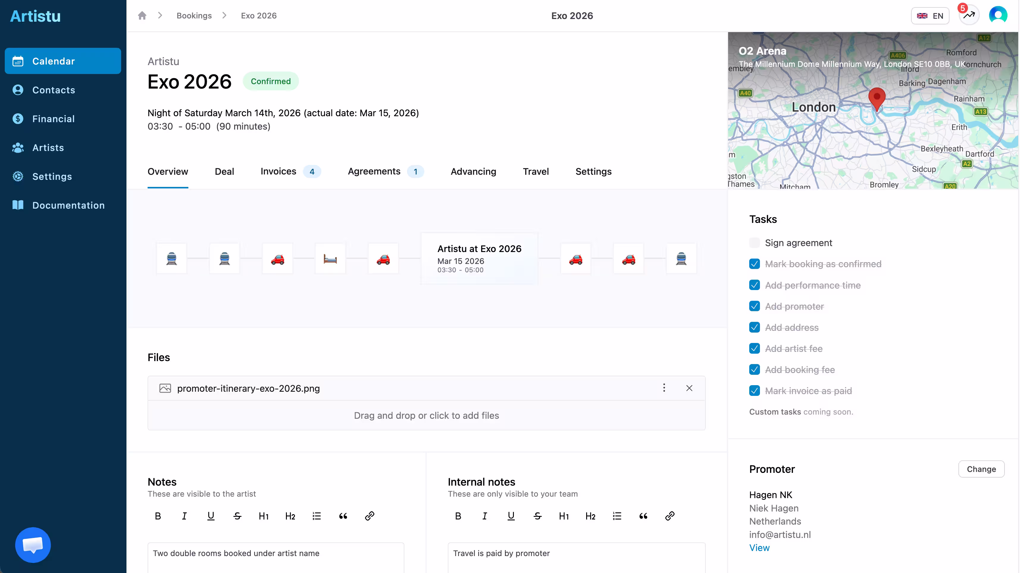 Artistu te da una vista única de todas las reservas de tu roster, con el estado de un vistazo: consulta, opción, hold, confirmado o cancelado. Los artistas ven sus bolos confirmados sin que tengas que reenviar los detalles manualmente.