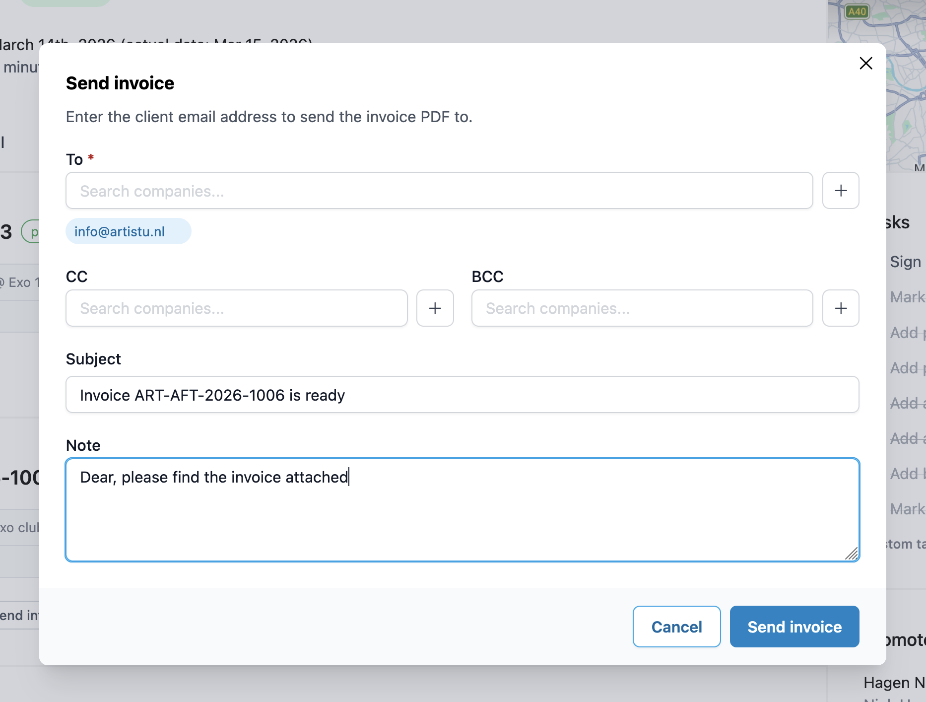 Genera una factura desde tu reserva en dos clics. Envíala directamente al cliente por correo, o a través de Peppol para agencias europeas. La factura llega al sistema contable del cliente sin que nadie tenga que imprimir ni adjuntar nada.