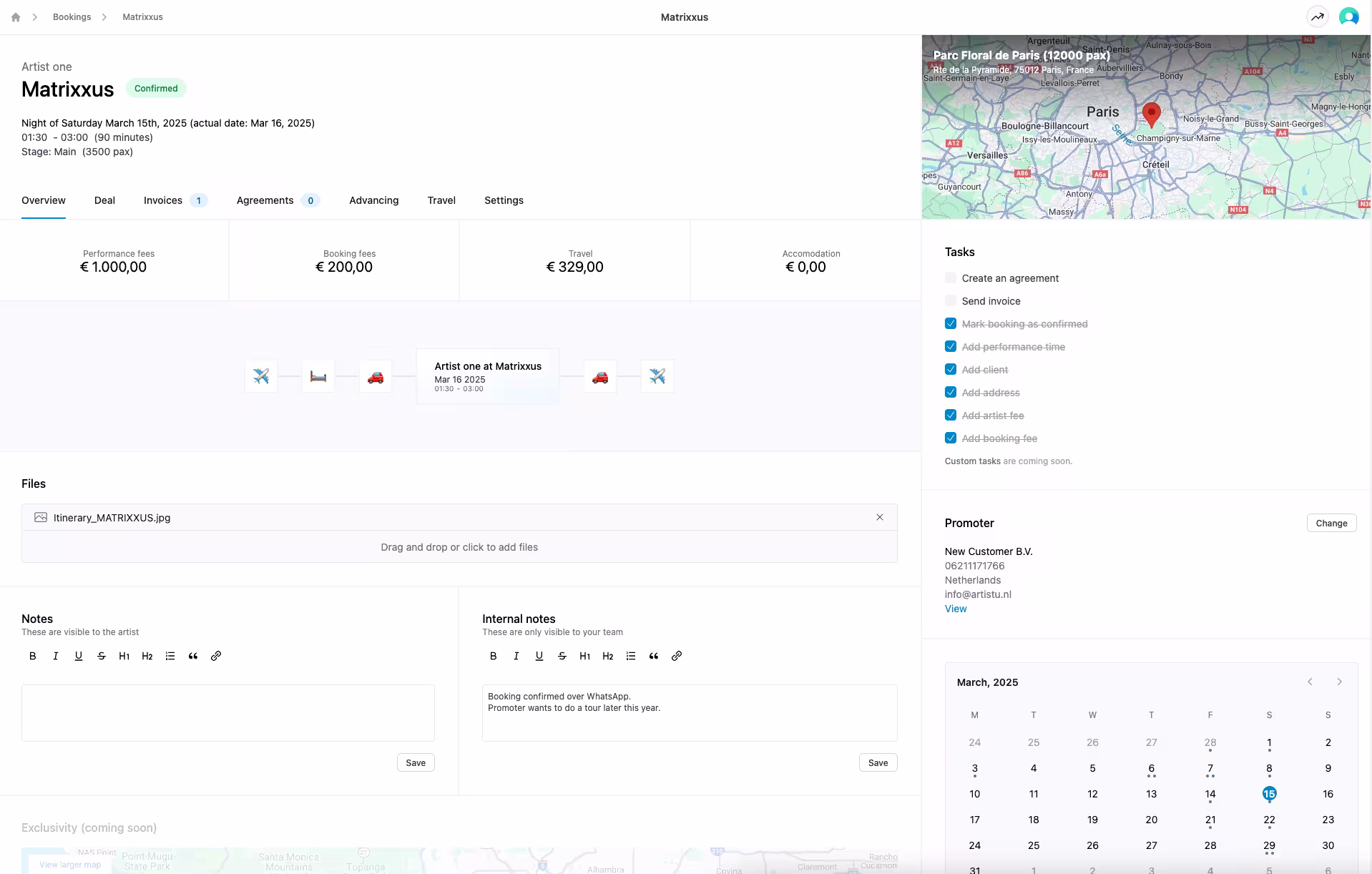 La sección de logística incluye ahora más espacio y estructura para los detalles relacionados con los viajes. Ya sean vuelos, reservas de hotel o transporte local, puedes introducir y revisar toda la información necesaria en un solo lugar consistente. Es más fácil tanto para los artistas como para los managers saber dónde deben estar y cuándo.