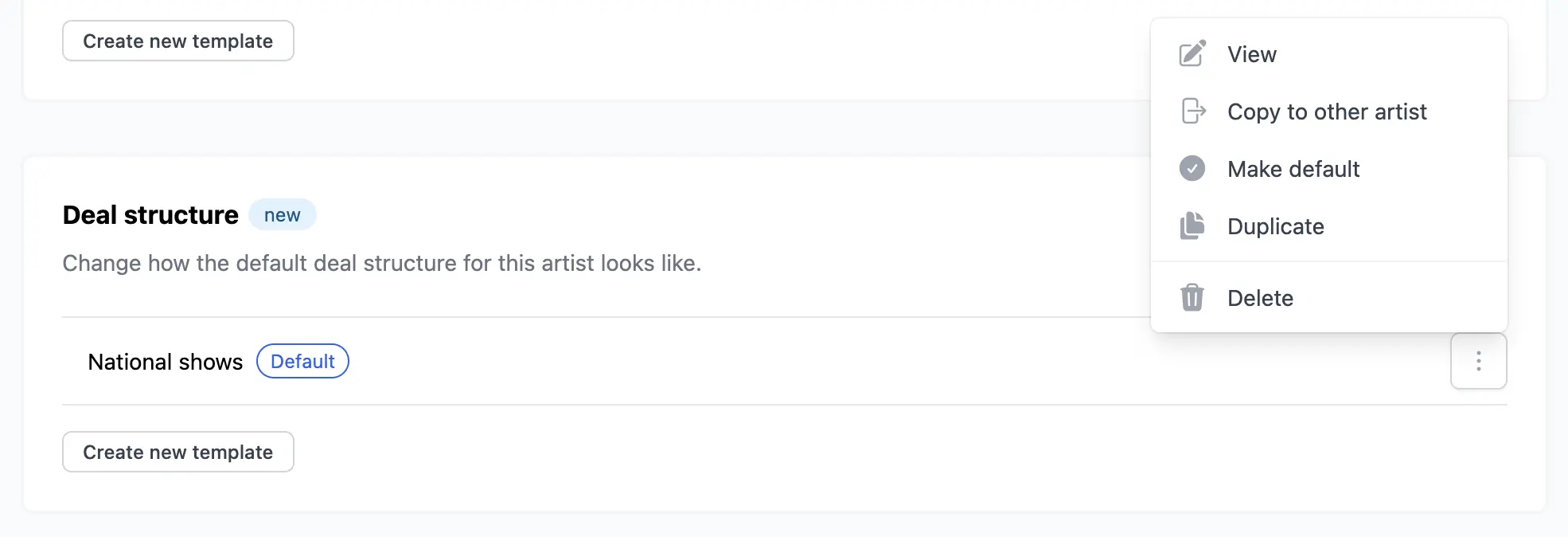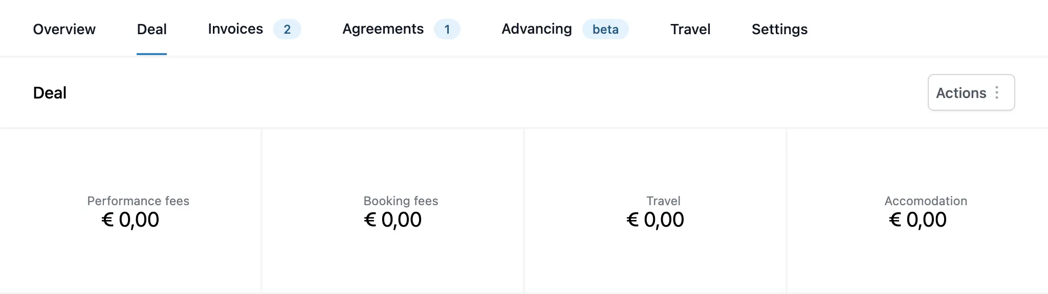 Las plantillas de acuerdo de artistas son útiles para establecer valores predeterminados en los campos de los honorarios (frais) de una reserva. Esto te permite personalizar Artistu para mostrar las estructuras de acuerdo que usas comúnmente, ahorrándote tiempo al crear nuevas reservas.