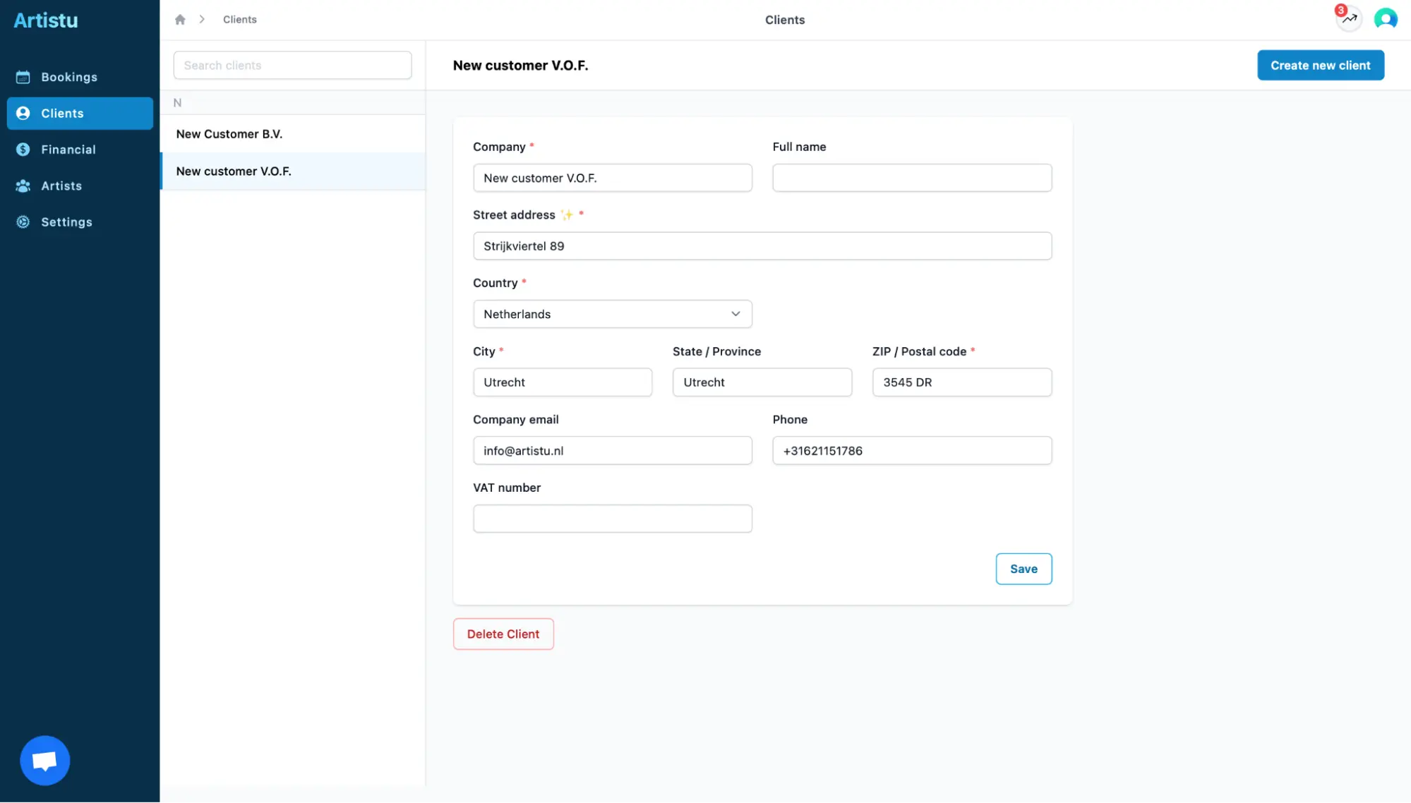 Artistu te permite añadir todos los contactos relevantes y su información al sistema. Al crear reservas, los detalles del cliente se pueden reutilizar para acelerar tu flujo de trabajo.