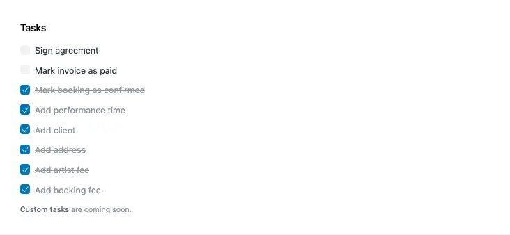 Cada reserva incluye una lista de verificación de tareas para asegurar que cada parte de la reserva se complete. La lista de tareas incluye: