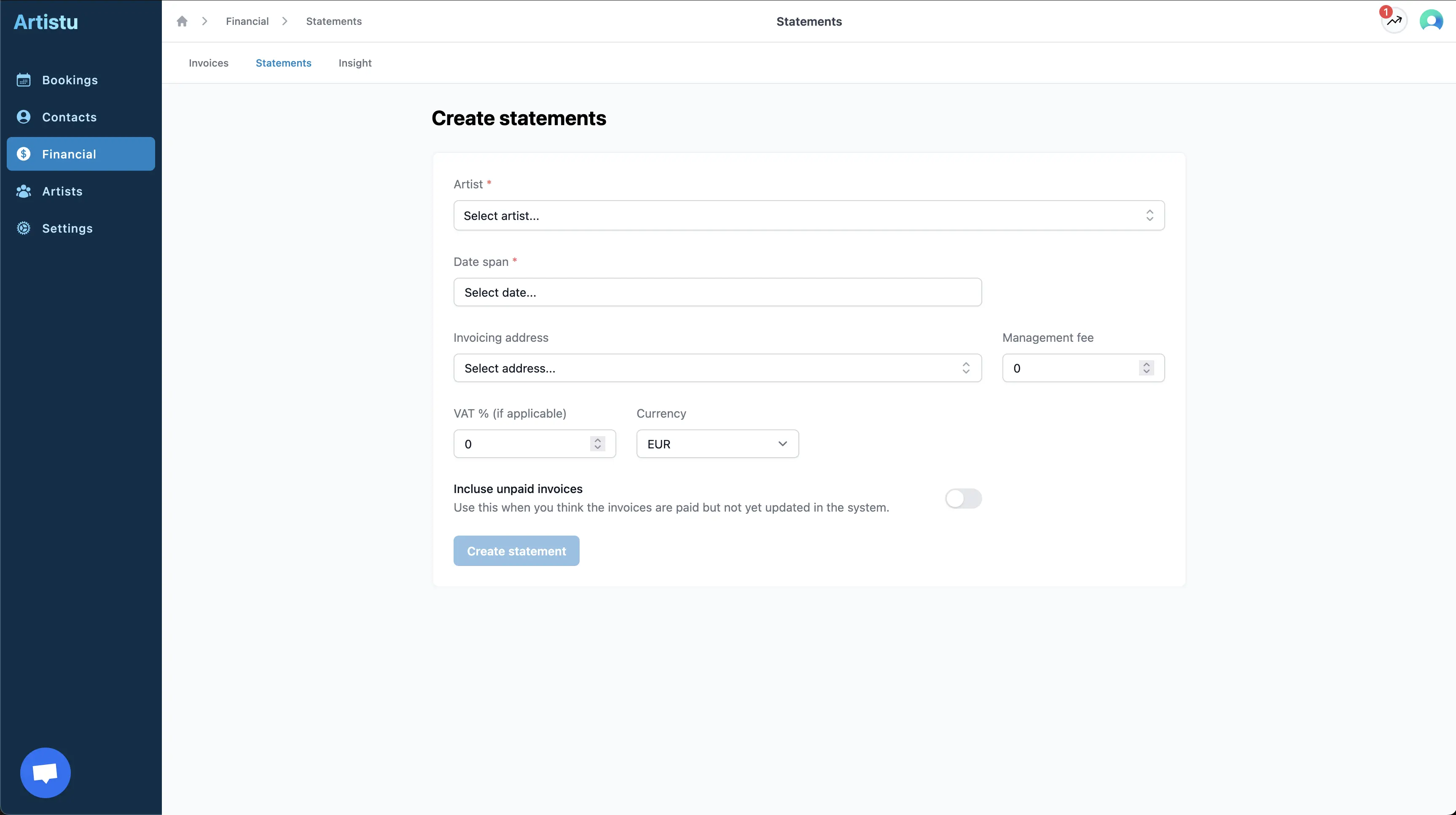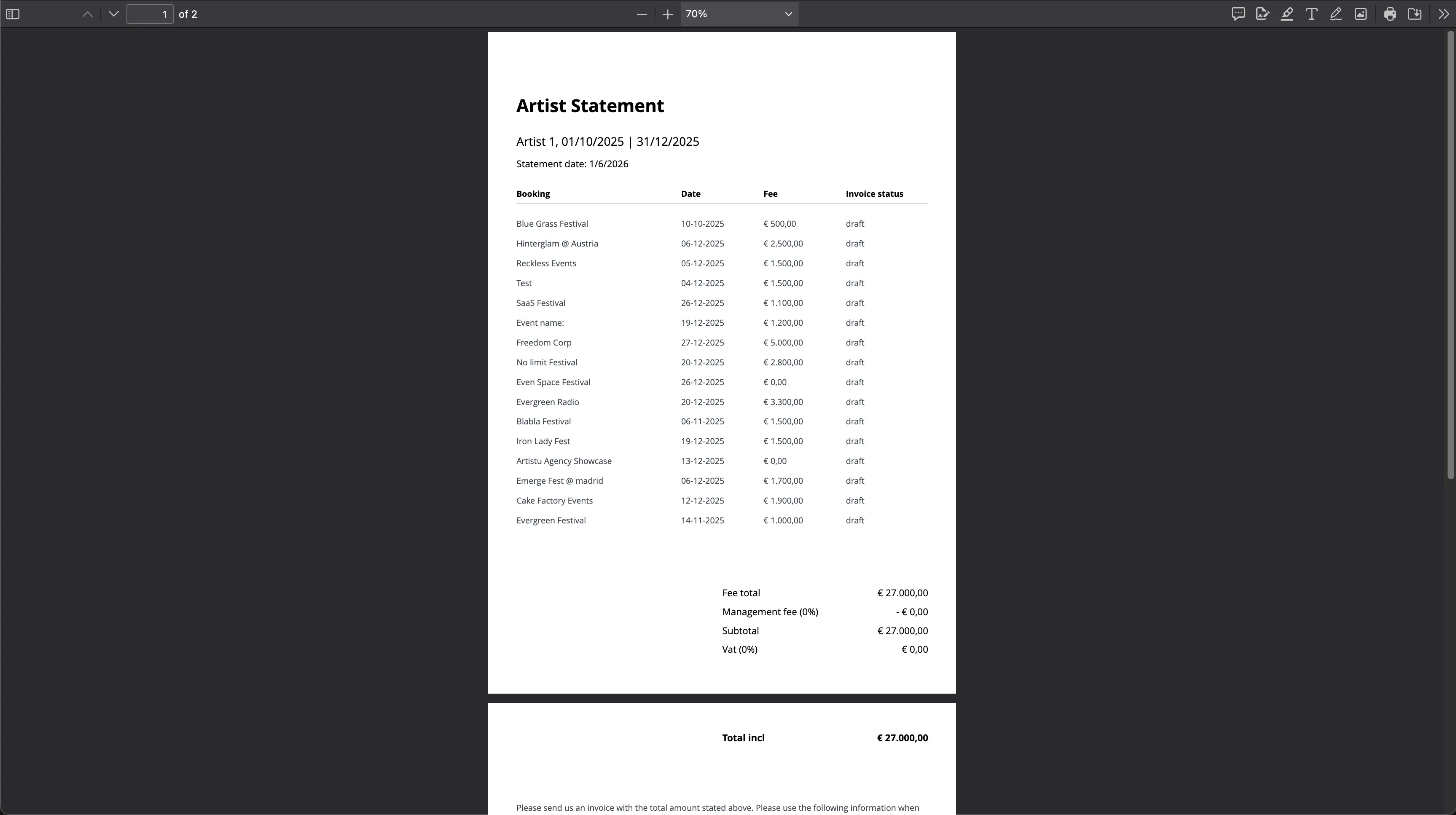 Una vez guardado, el estado de cuenta se crea y se almacena en tu panel de control. Los estados de cuenta se pueden descargar y compartir, asegurando que los artistas siempre tengan una comprensión clara de sus finanzas.